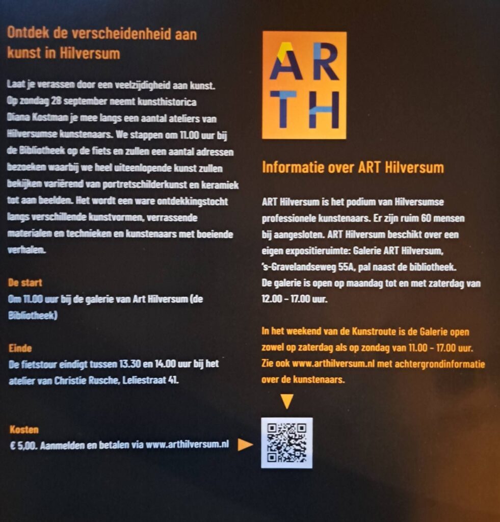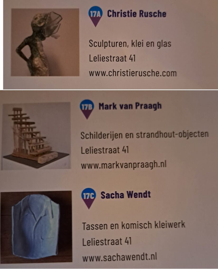 27 en 28 september 2025 is er een kunstroute in Hilversum. Sacha Wendt en Mark van Praagh doen mee. Zij exposeren in het atelier van Christie Rusche, Leliestraat 41, Hilversum